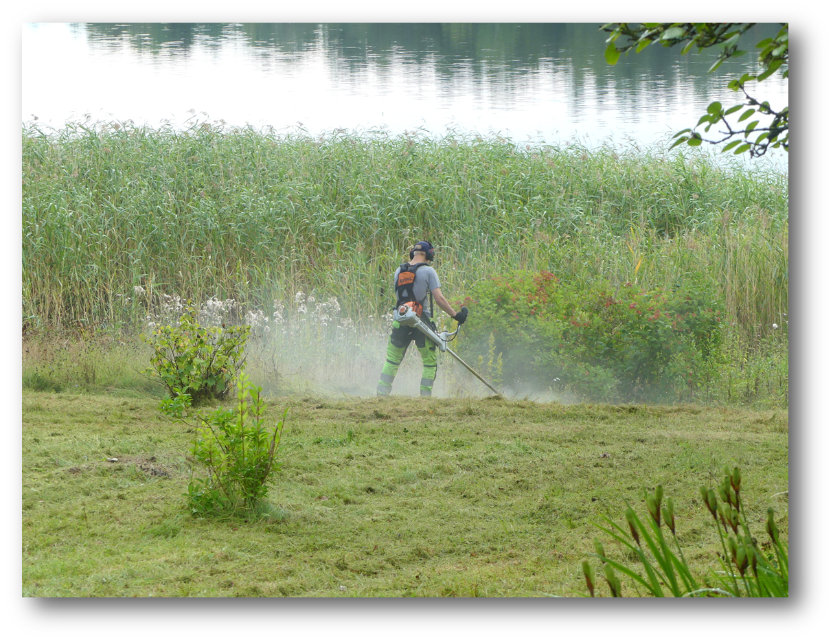 Efter en plötslig regnskur klippte och trimmade han det långa gräset (därav vattenmolnet på bilden) på husets östra sida. När solen tittade fram igen röjde han buskarna som har vuxit upp i ”djungeln” nedanför köksfönstret och fortsatte med att putsa i stranden.