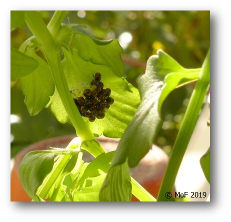 Härom dagen upptäckte jag en liten äggsamling på ett violblad. Undrar vem/vad som har det bladet som förökningsställe?