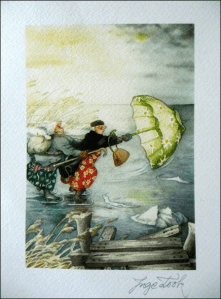 Det innehöll en grov handduk i hellinne och en tvål märkt Kärringtvål. Synnerligen lämpliga presenter till en kärring i min ålder. 🙂 Kortet med två glada tanter på isen föreställde oss förklarade hon. Gulligt av henne. Nästa år är det hennes tur att fylla jämnt.