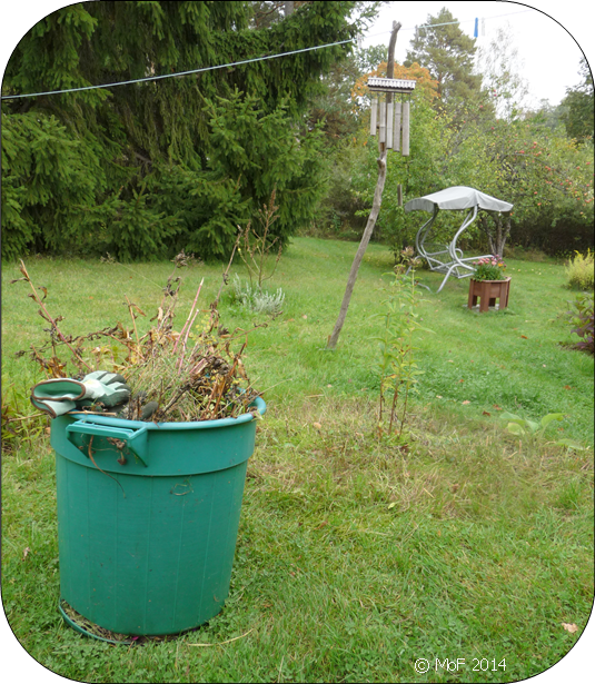 Igår hade Udden ännu 17 grader varmt trots att solen för det mesta skymdes av molnen. Perfekt väder för att inleda höststädningen! Såpnejlikorna närmast trappan fick finna sig i att bli nerskurna och förpassade till sophögen, hammocken är tömd på ”inredning” och blomlandet utanför sovrummet är ansat och delvis modifierat.
