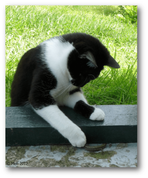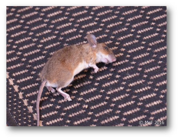 Därmed var kvällens ”underhållning” räddad. När vi gick och la oss tog hon också paus i arbetet. Den fiffiga skogsmusen hade nämligen hittat ett utmärkt tillhåll under köksspisen och var oåtkomlig trots mödosamma insatser från mattes sida.