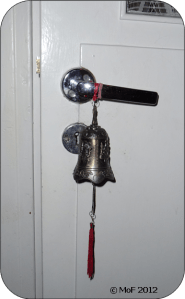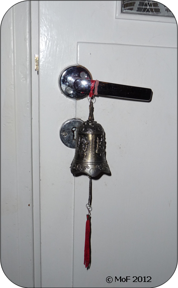 Så länge vattendunkarna stod på verandabänken använde Mia locken som släpp in mig-signal, men så här års förvarar jag dom i köket. Då har hon i stället puttat på dom två fjuttiga metallklockorna som satt på handtaget, men dom hörde jag inte alltid så idag har dom ersatts av en ny klocka, modell större.