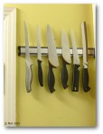 Härom dagen såg Husse en bättre lösning i ett reklamblad. Ett magnetfäste på väggen. Det innebar att ett annat knivställ som hängde på väggen fick flytta på sig, men efter den rockaden fick magnet­listen plats. Perfekt!