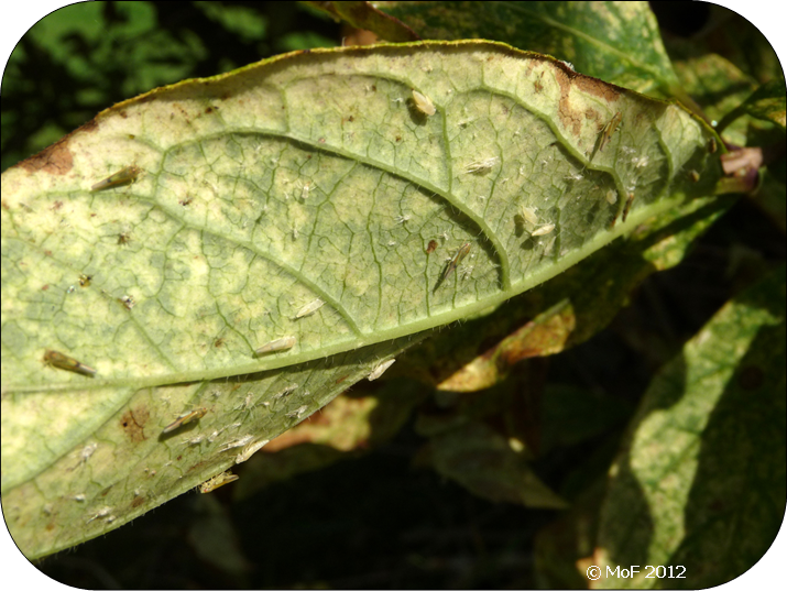 Värre är det med dvärgstritarna som har invaderat den ungerska syrenbusken. Varje gång jag går förbi ser jag en svärm flyga upp. Alla blad på busken är mer eller mindra angripna, dom flesta är vid det här laget gula eller bruna.