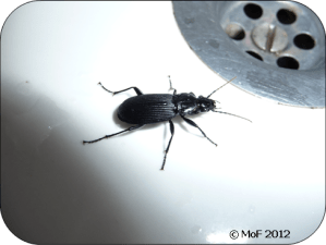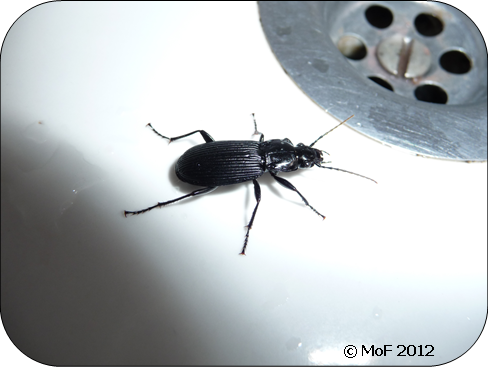 Jag har för all del inget emot skalbaggar heller. Om jag har artbestämt dom rätt är det jordlöpare, men varför och hur dom har förirrat sig in i badrummet är en gåta?