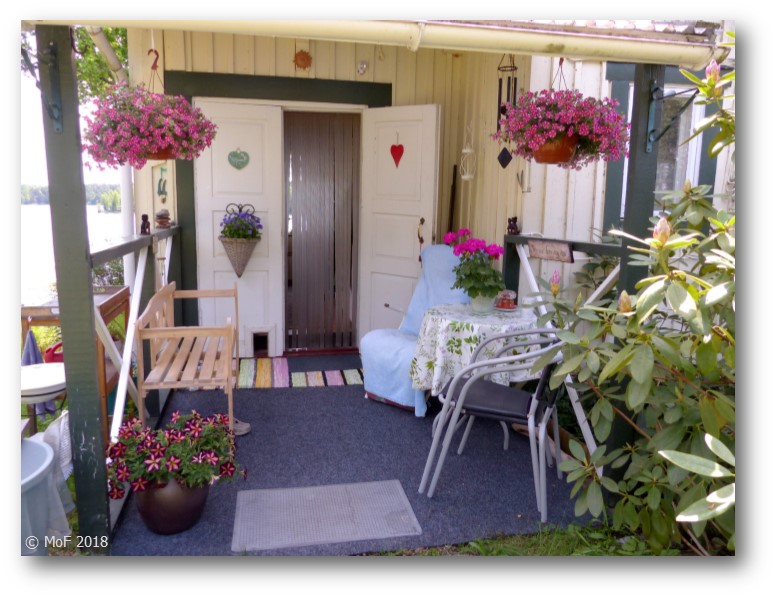 På onsdagen medgav väderleken att våra besökare kunde dricka kaffe i bersån. Husses son med partner gjorde premiärbesök på Udden. Dom hade heller inte förstått att man är lika välkommen tomhänt… Med sig hade dom en hel kasse med presenter till både Mia och oss. Tack igen! 🙂