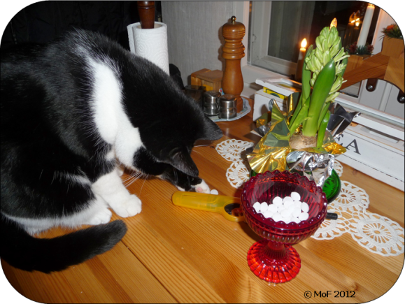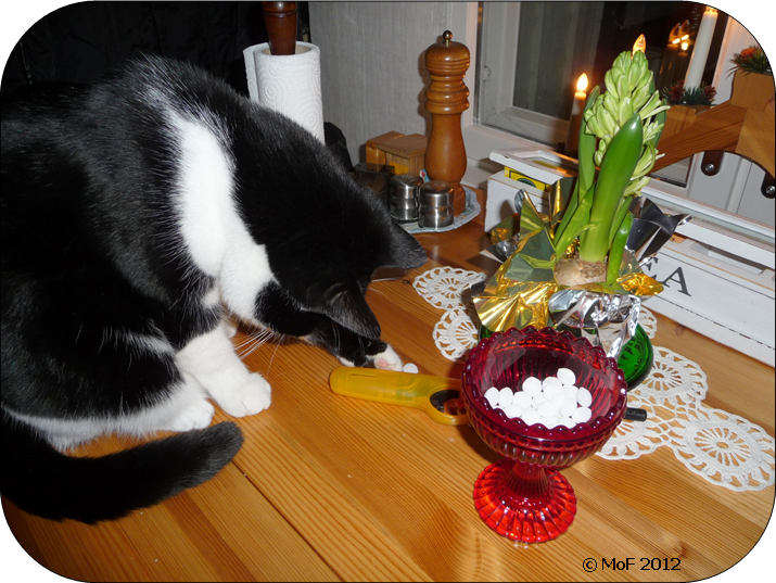 Mia tycker tillvaron är urtråkig. Ute vill hon inte vara och inne finns det inget intressant att göra. I brist på annat petade hon ur en eukalyptuspastill från skålen jag har på köksbordet och roade sig med en stund igår kväll.