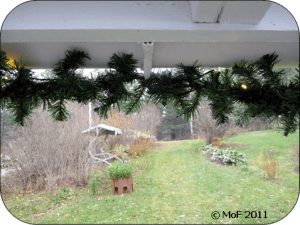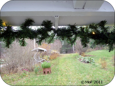 Nu är det vintertomt utomhus. Sist av allt tömde jag regntunnan vid trappan och bar in den i boden och skräp-/insektsskyddet hänger på tork i badrummet. Eftersom jag var på ”julhumör” hängde jag också upp ljusslingan ovanför trappan, mest för att slippa göra det när fingrar och elkabel är stelfrusna.