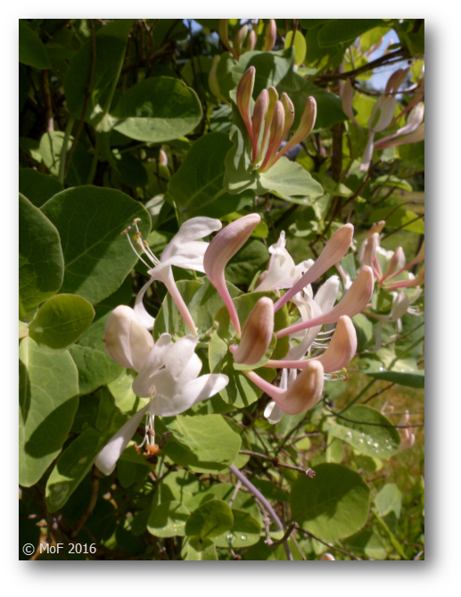 Jag ställde mig tveksam till svaret jag fick, men i dag insåg jag att kaprifol var rätt svar. Mellan gran­kvistarna syntes kaprifolknoppar. Hur den har tagit sig dit är ett mysterium? Men om den trivs där är det helt OK för min del. 😊