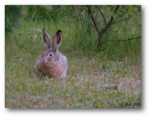 I ögonvrån syntes nåt brunt som stack upp ur gräset på tomtens östra sida. Först antog jag att det var en kvist som ramlat ner från eken, men när jag tittade närmare såg jag ett par långa öron och kroppen på en hare.