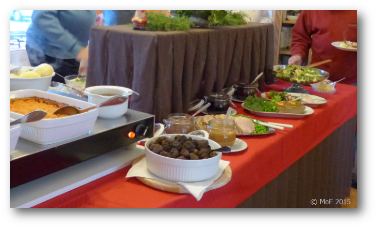 Eftersom våra mattider inte är som andras, bokade vi in oss på sista dukningen kl 15. Det var vi inte ensamma om insåg vi när vi ställde oss i kön till matbordet.