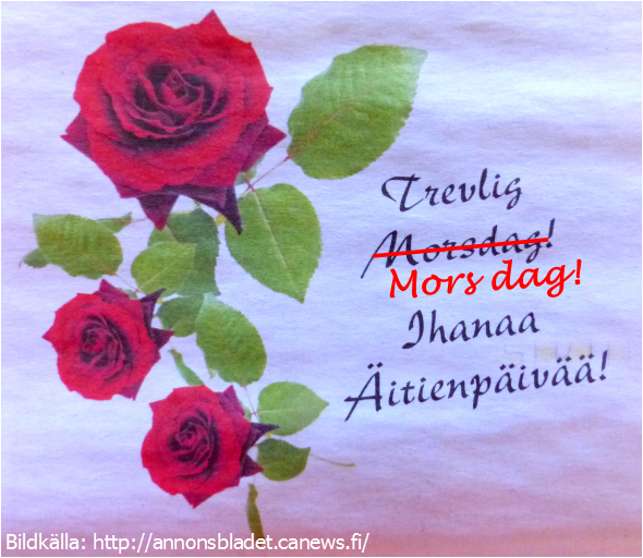 I torsdags reste sig nackhåren igen då jag läste Annonsbladet. Har du nånsin hört talas om Morsdag? Det måste ju vara en dag när man morsar mer än vanligt? I samtliga annonser gjorde man reklam för hälsningsdagen. Jag trodde alla – i synnerhet proffsskribenter! – visste att vi firar Mors dag och inget annat?