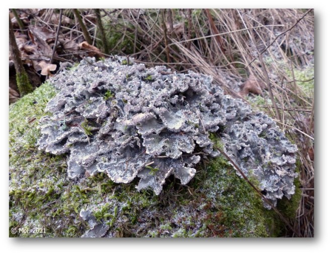 När vi vände tillbaka hemåt hade jag nästan fyllt botten på korgen med trattisar och passerade ett glest snår med getpors (skvattram). Innan vi nådde bebyggelsen fick jag syn på ett av mina absoluta favoritmotiv: en bit murket trä som pryddes av olika sorters lav. Oj, så fint! Naturen är den överlägset skickligaste konstnären!