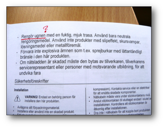 Jag hade redan fyllt skåpet innan jag tog en titt i instruktionen. Aj då, jag borde ha monterat en medföljande ”bakre distanshållare” och torkat det invändigt innan jag tog det i bruk läste jag. Till min stora förvåning såg jag att kylskåpet också inrymmer en ugn?!