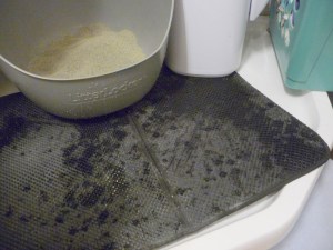 Rörmokaren har tipsat om att ett ämbar vatten avhjälper problemet, så jag fyllde ett, men naturligtvis skvimpade vattnet över kanten och ner på plastmattan framför Mias toalett. En del hamnade också på golvet och på mina byxor. Till all lycka missade jag kattoaletten.