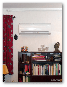 Jag slog på luftvärmepumpen och ställde in den på kylning. Ha! Funkade hur fint som helst. Inget ylande hördes ens. På nolltid sänktes inomhustemperaturen med nästan 10 grader i vardagsrummet.