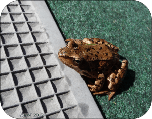 Faktiskt fanns det ändå lite vatten att ösa. När jag var klar ställde jag mig på bryggan. Plötsligt fick jag syn på ett litet huvud och en hals som stack upp mellan bräderna. Vi var iakttagna av en nyfiken liten snok.