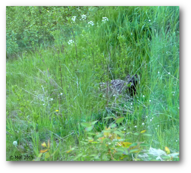 För att stilla min nyfikenhet gick jag ut och tog en titt. En bit från vedhögen såg jag en vuxen mårdhund som stod och tittade stint på Mia som låg i gräset och tittade lika stint tillbaka. Hon var självfallet beredd att försvara sitt revir föreställer jag mig.