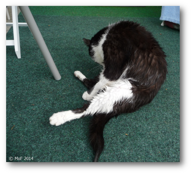 Idag fick jag nog. Den fuktiga värmen fick insekterna att formligen kasta sig över mig medan jag (klädd i bikini) klippte bort blomställningarna på dom utblommade lupinerna, så jag gick in och smorde benen med myggolja. Det var faktiskt effektivt. Efter det bet dom mig på låren och överkroppen i stället. 😦