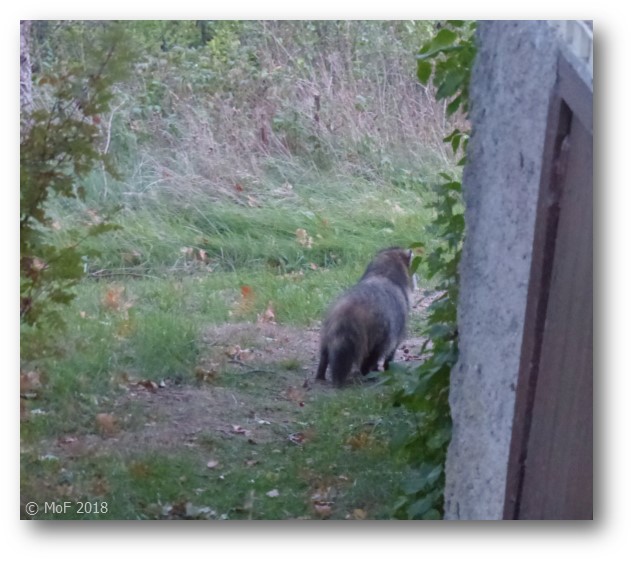 När mårdhunden såg att jag närmade mig tyckte den att det var säkrast att dra. Mia kom tacksamt(?) fram till mig och vi gick in båda två.