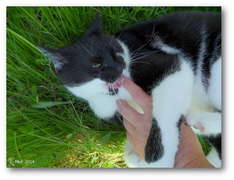 Jag började tycka synd om henne till slut, så jag greppade skogsmusen och gick henne till mötes. Och oj, vad poppis jag var! Efter det lugnade hon sig och gick in så jag kunde avsluta jakten i godan ro. Då jag var klar kändes det som om det började bli läggdags så jag gick också in och så småningom la jag mig på min plats i sängen bredvid matte.