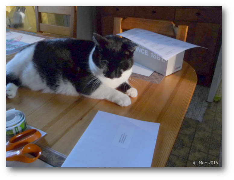 När han så småningom försvann såg jag min chans. Matte stökade med en massa papper på köksbordet så jag hoppade upp och la mig så nära henne som möjligt för att äntligen få lite ömhet och kärlek.