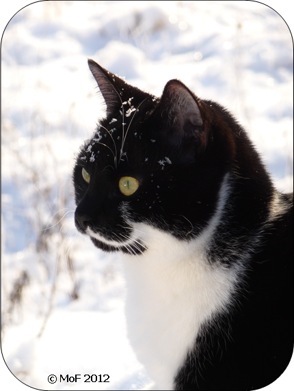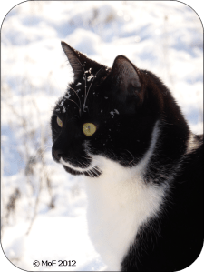 Jag blev lite chockad när jag öppnade ytterdörren i förmiddags – snömängden var påtagligt större än jag hade förväntat mig trots att jag hörde snöplogen klockan åtta. Mia blev tydligen också förvånad och eftersom jag inte hade sopat eller skottat gick hon ingenstans utan satt bara på trappan en kort stund.