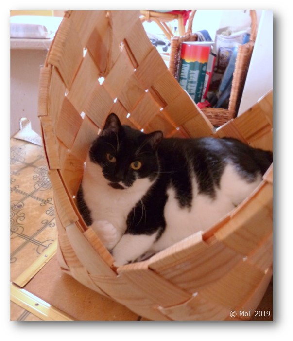 Med tanke på Mias förtjusning i vedkorgen borde vi kanske skaffa en egen korg till henne? Så snart vedlagret har minskat så mycket att hon får plats lägger hon sig i den. En tom korg är förstås ändå bättre. 🙂
