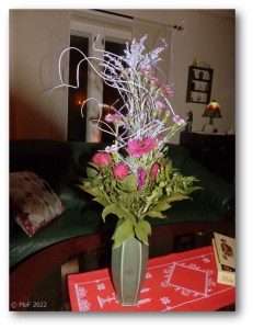 Vi fick två vackra blombuketter, varav den ena var ett veritabelt konstverk. Den andra var också tjusig på sitt sätt – en stor bukett med röda och vita rosor. Färska blommor i alla former är alltid välkomna, i synner­het så här års.