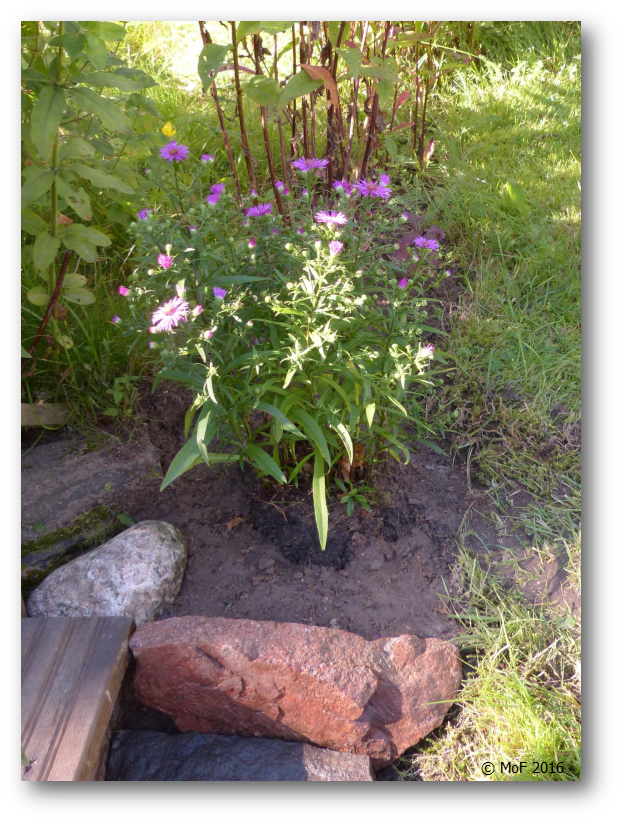 Jag letade rätt på vattenskopan, puttade ner ormen i den och bar ut ”ekipaget” till rhododendronbusken bredvid trappan. Mia fick stanna inne, annars hade hon förstås fortsatt jakten.