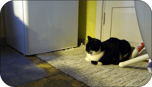 Efter frukost har Mia återgått till vaktplatsen framför frysen. Förr eller senare lär väl musen röra på sig hoppas vi. I annat fall får jag försöka flytta på kylskåpet så att jag eventuellt kommer åt att peta bort den ovanifrån.
