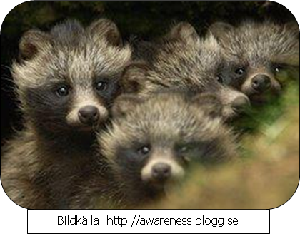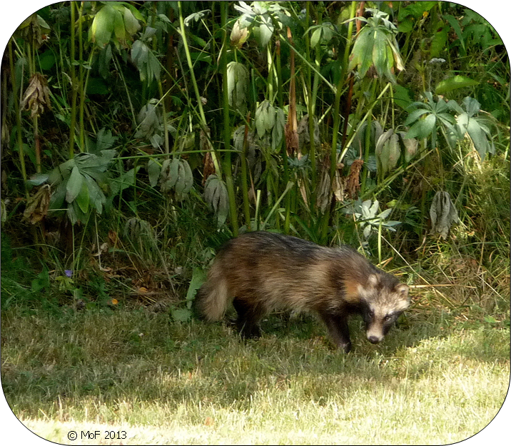 Årets mårdhundsvalpar är nu utslängda från boet och ungefär i samma storlek som Mia. Idag (kl 13:10) över­raskade jag en valp som sökte ätbart på sop­hö­gen bland syrenerna.
