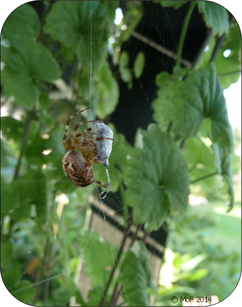 I förrgår satt jag ute på trappan och tog mig ett ”os” efter väl förrättat värv. Gräsmattan (och diverse äpplen) var nyklippt(a). Utan att tänka mig för askade jag i riktning mot vintergrönan, jag hade glömt att korsspindeln har sitt nät just där.