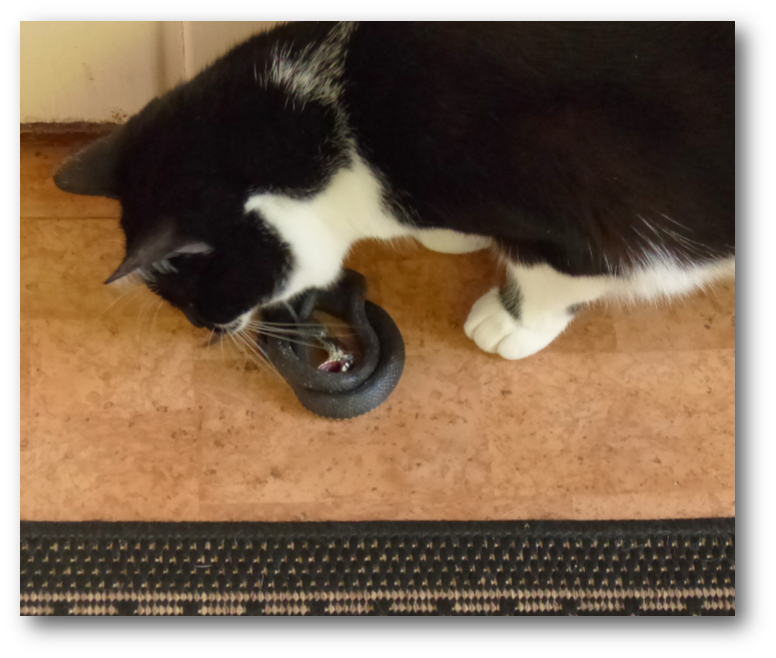 Ormar är extremt duktiga på att spela döda har jag lärt mig. Mias intresse för den till synes livlösa ”härvan” som låg på mattan i verandan försvann genast då den inte längre rörde på sig så när hon hade försvunnit ur synhåll bar jag ut ormen och la den på en solbelyst gräsfläck.