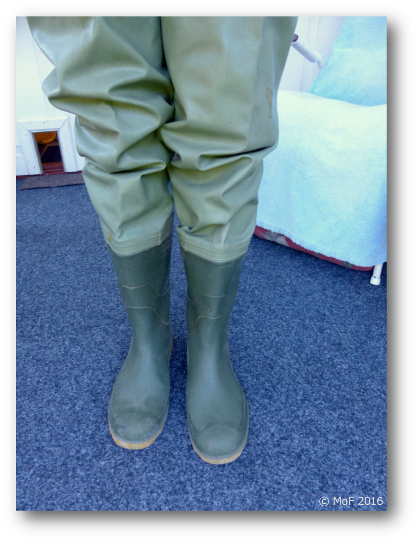 Arbetet löpte på bra ända tills jag upptäckte att den ena stöveln läckte, men jag lät mig inte hindras. När vattnet började sippra in ovanför stövelkragarna och jag blev blöt i ändan bestämde jag att det fick duga. Dom få stråna längst ut kan jag leva med eller klippa av från båten vid tillfälle.