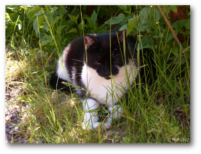 Trots att jag högljutt sjasade i väg den, gjorde den sig ingen brådska. Människor uppfattas förstås inte som fiender. På trappan satt Mia och klappade i tassarna, hon gillar dom ju lika lite som jag.