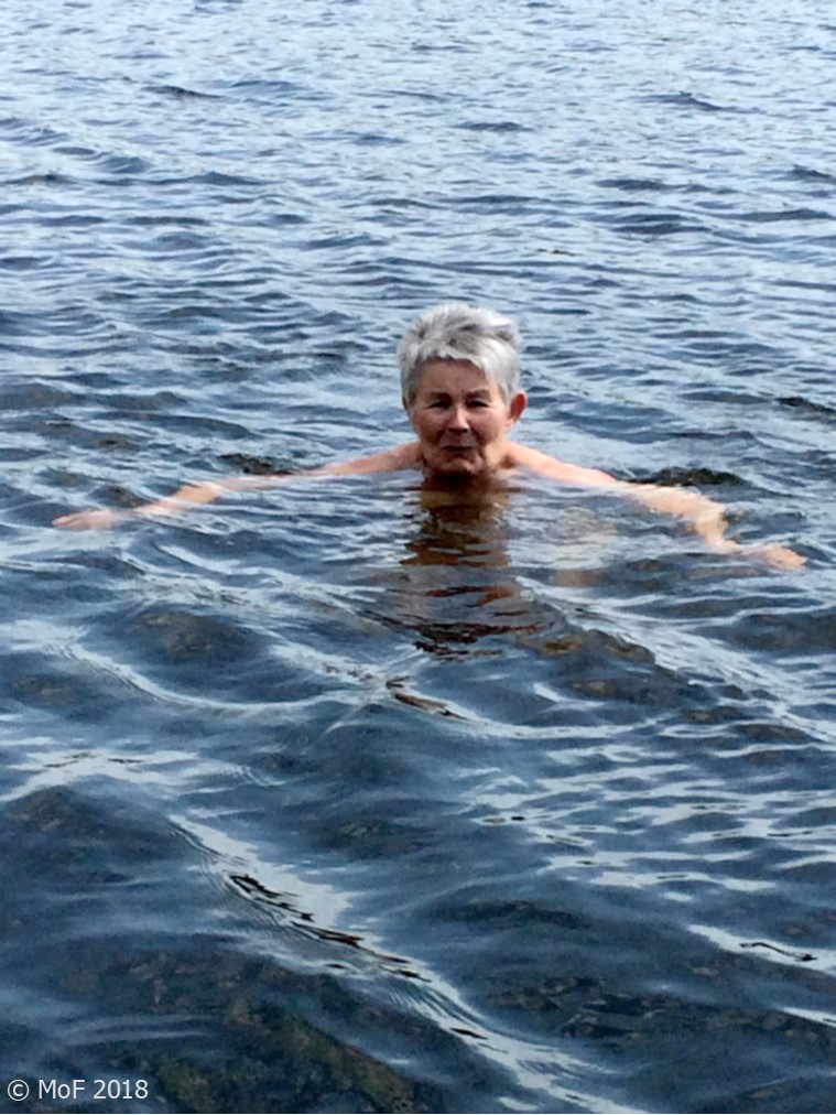 Och si, det gjorde jag. Vattentermometern visade redan 19°. ”Jamen det är ju vid ytan det” påpekade han. Han hade förstås helt rätt. Så snart jag kom lite längre ut stelnade blodet nästan i ådrorna, så jag simmade ögonaböj tillbaka till bryggan.
