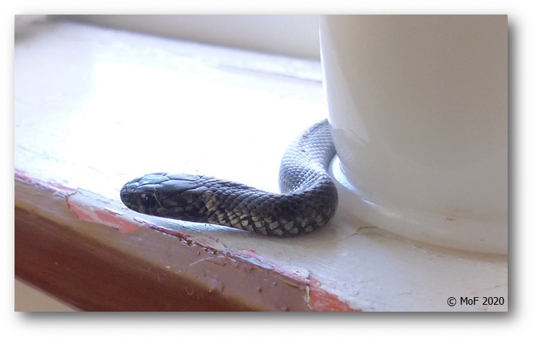 För att kunna putsa tändstiftet till gräs­klip­paren (som inte ville starta) bad Husse mig hämta en nål. Då jag gick ut i verandan upptäckte jag plötsligt en orm på fönsterbrädan. En pytteliten snok konstaterade jag.