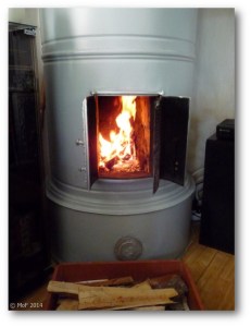 Eftersom vi har eld i köksspisen flera gånger per dag, lagar jag mat på spisen. Det märktes speciellt tydligt en dag då solen tittade fram. Kaklen ovanför spisen var prickiga av stänk från stekpannan. Men dom går ju enkelt att få bort.