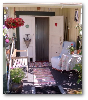 Den som är observant ser att det saknas en blomma i ”dörrkorgen”. Där har en Mors dagsros stått tidigare, men eftersom knopparna inte ville slå ut, tog jag in den i köket. Nu har dom slagit ut, så endera dagen får den flytta ut igen.