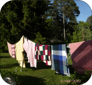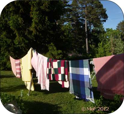 Innan jag la på mattorna sköljde jag av mig själv också i sjön. Sen tog jag en lunchpaus innan jag damm­sög i verandan och la på dom nyinköpta stolsdynorna. Vid fyrasnåret var jag äntligen färdig. Nu kunde jag hämta morgontidningen och med gott samvete avnjuta en mugg kaffe ute på trappan.