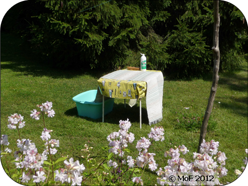 Både skur- och sköljprocessen försiggick uppe vid huset den här gången. Jag hade ju massor med regnvatten till hands och bordet jag brukar använda som skurbräda står vid trappan i år.