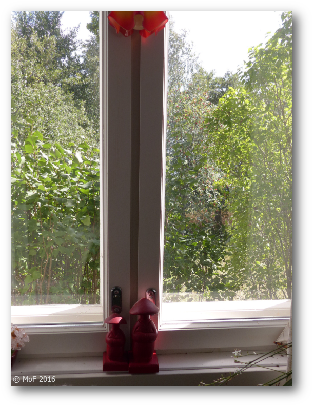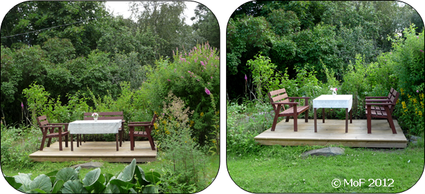 För att försöka variera mig beslöt jag möblera om i bersån. Tanken var att man inte skulle se så mycket av dom stympade syrenstammarna. Den nya möbleringen gällde i högst en timme, sen flyttade jag om så som jag hade det tidigare, mest beroende på att det såg trångt ut intalade jag mig. 😉