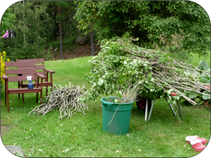 I förrgår tyckte Husse det var lämpligt väder att kapa syrenerna vid uthuset, så då tyckte jag det också. 😉 Kommande dagar spåddes nämligen nya regnväder. Husse sågade och jag gick loss med kvisttänger och häcksax.