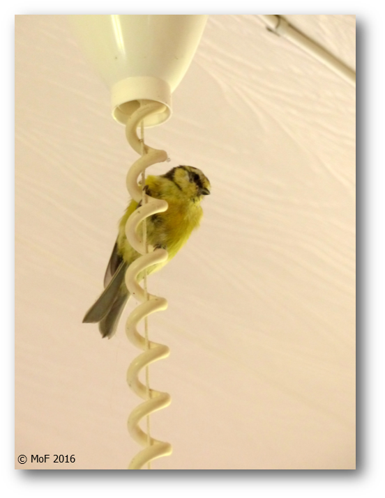 Gårdagen började ovanligt livat. Mia kom in med en liten pippi som hon släppte på golvet. Fågelungen var vid full vigör och flög genast runt i köket tills den hittade ett lämpligt ställe att landa på strax under taket.
