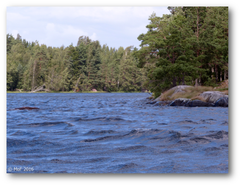 När jag hade passerat Hästholmen upplevde jag riktig sjögång för första gången på länge på vår fina sjö. Båten rullade i vågorna och vågkammarna kröntes av skum. Det gällde att ta i med årorna ordentligt annars kom jag ingen vart alls.