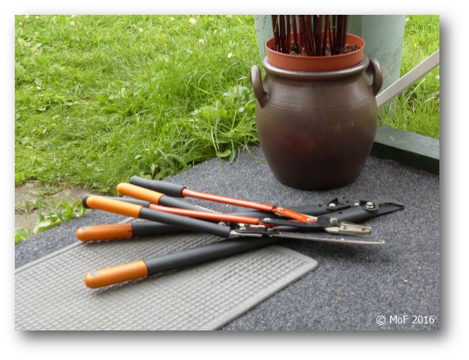 I förrgår tog jag i tu med oönskad växtlighet. Både kvist‑ och häcksax kom till användning. Kvistsaxen rådde på början till allsköns buskar och plommonträd, häcksaxen gjorde effektivt slut på nya skott.