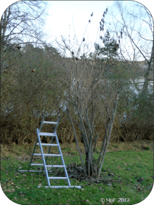 Idag klantade jag till det igen. En av dagens arbets­upp­gif­ter var att beskära schersminbusken och för att nå dom längsta kvistarna krävdes stege.