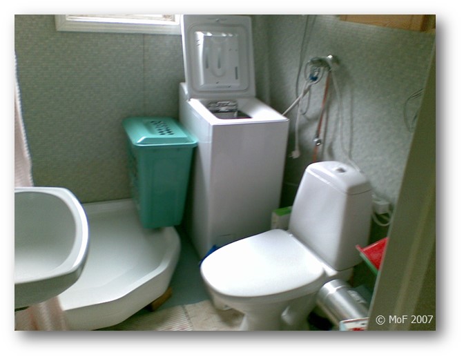 Ut med isoleringsskivorna som Husse monterade för ett par år sen, våtrumsmattan och badrumsmattan plus attiraljerna som hänger på väggen ovanför toastolen. Dagens besök gällde nämligen rensning av avloppsröret som var bäst att komma åt genom att lyfta av toastolen.
