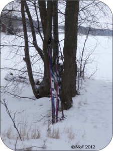 Jag drog på mig täckbyxorna och IMS-jackan (som jag fick strax innan jag slutade 1997), sa hej då till Mia, bar ner skidorna till stranden och spände på dom. Ett kort ögonblick undrade jag över vilken som var högerskidan innan jag kom på att dom är likadana. 😀 För att ha en ”ångerknapp” beslöt jag att se hur det kändes när jag hade kommit en bit på väg.